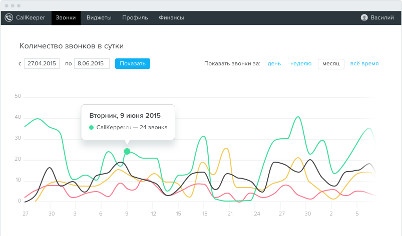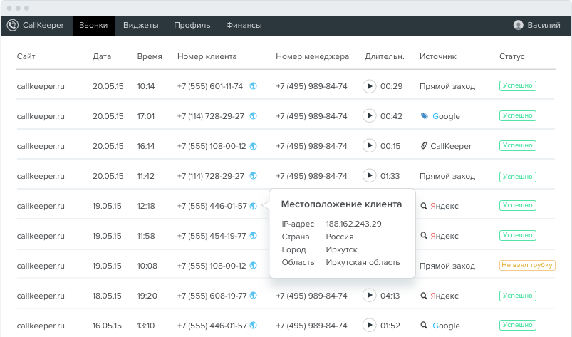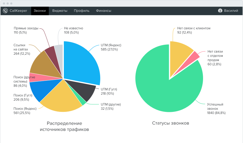 CallKeeper собирает данные и изменяет под них свой алгоритм работы. Показывайте виджет только для определенных UTM-меток или запретите приложению предлагать звонки для посетителей вне рекламного трафика. Быстрая настройка в простой панели управления аккаунтом.